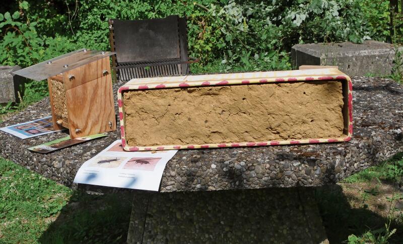 Barbara fand zufällig in Möhlin auf einer Baustelle der Saline Lösslehm, das ideale Material für die grabende Mauerbiene. «Diese muss gefördert werden», erklärte Barbara. «Von den Bienen, die in den käuflichen Bienenhotels wohnen, gibt es genügend.» Der zu trockene Löss wurde befeuchtet und geknetet, dann in Holzboxen abgefüllt und verdichtet. Für ihre Brut brauchen die Bienen kleine Hohlräume. Mit spitzen Stäben werden fünf Zentimeter lange Löcher in den Löss gebohrt. Das dunkle Loch lockt dann die Bienen an. Sie bohren sich weiter hinein und bilden Zellen hintereinander, in die sie ihre Eier legen. Nach einiger Zeit schlüpfen die Männchen, die sich dann um die Weibchen streiten.