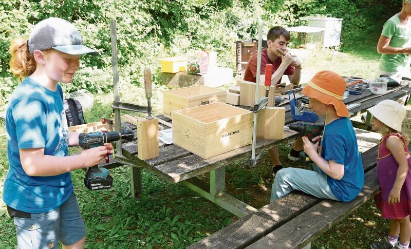 Einer der fleissigen Handwerker war Jaron Perret (7). Er arbeitete mit, weil sein Vater Mitglied der Umweltkommission ist. Wenn er nicht gerade Bienenunterkünfte baut, spielt er gerne Handorgel und Mundharmonika, sagte er stolz und sägte weiter an einem langen Bambusstab.